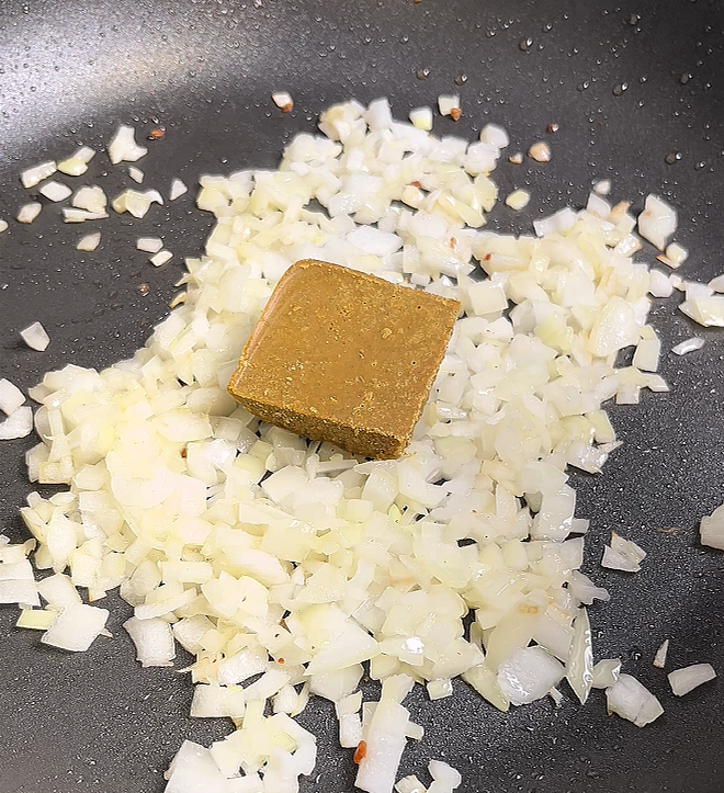 In the same skillet, add diced onions and cook until softened and lightly golden, about 2 minutes.Add curry cube