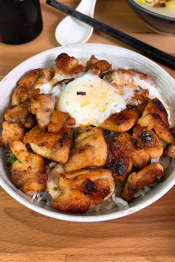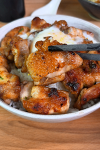 Spoon the lemon pepper chicken over a hot bowl of rice, serve with vegetables. Optional, top with an onsen egg. Enjoy!