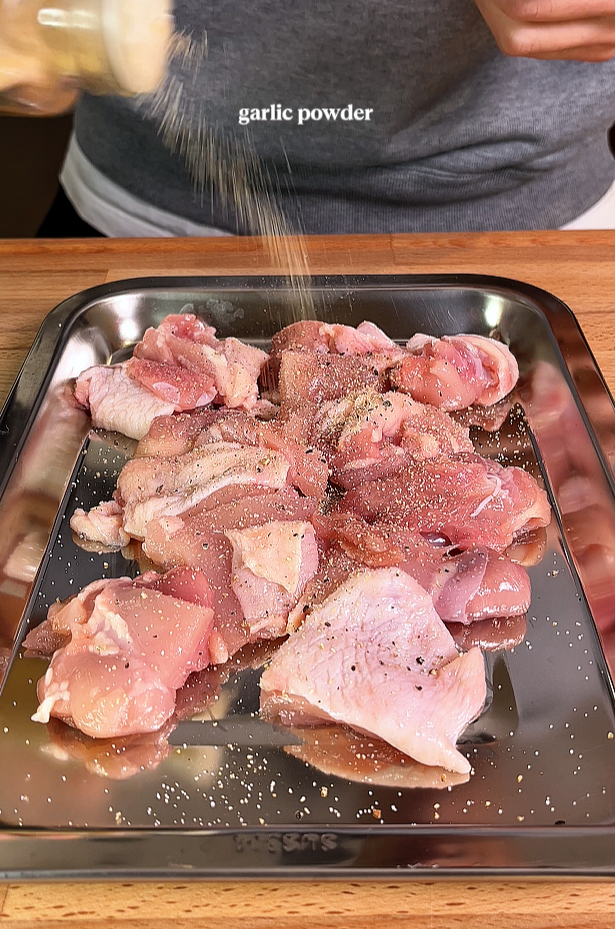 - Marinate the chicken: Season with salt, black pepper, garlic powder, sesame oil, and cornstarch. Mix well to coat each piece evenly. Let it sit for 10–15 minutes or as long as your schedule allows.