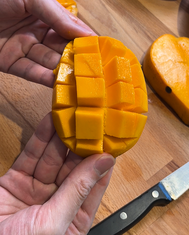 - Prepare the mango: Peel and cut the mangoes into cubes. Place half of the mango cubes in a bowl and set aside for serving.