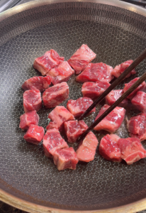 Warm a pan over medium high heat and add a small amount of oil. Add the marinated beef and pan fry on all sides for about 3 to 4 minutes until nicely browned. Transfer the beef to a plate and set aside.