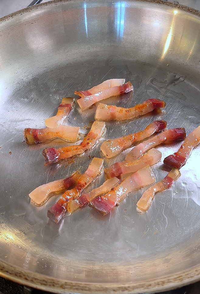 - Cook the guanciale:Slice your guanciale into small strips or cubes.Place it in a cold pan, then turn the heat to medium. Let it cook slowly until the fat renders out and the pork turns golden and crispy.Remove from heat and set aside. Do not drain the fat.