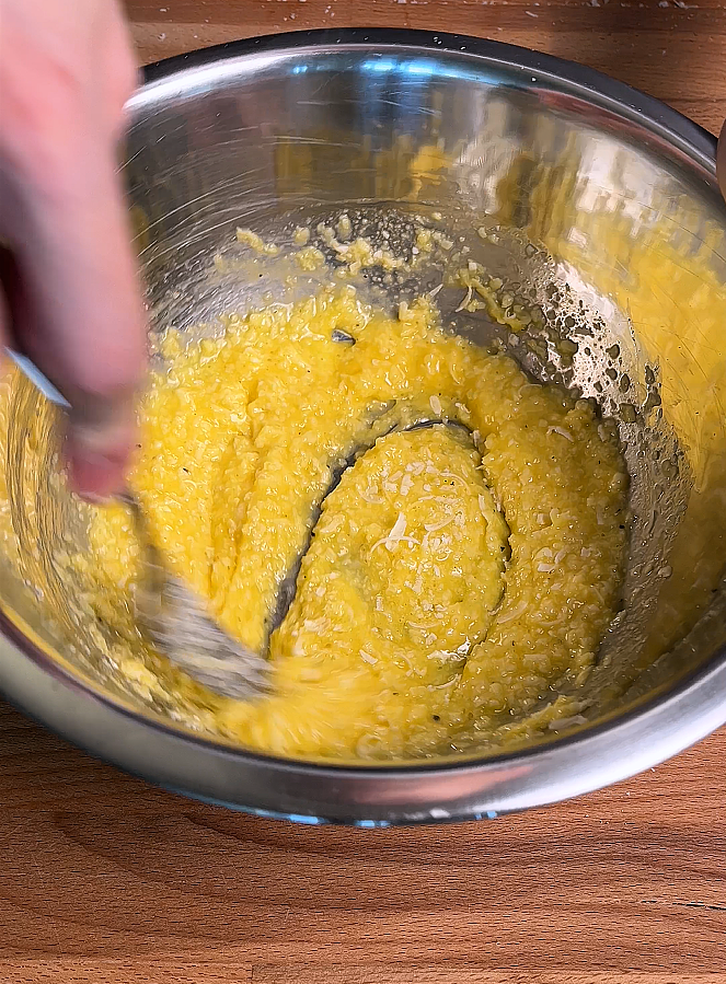 In a large bowl, whisk together eggs, egg yolk, grated cheese, and black pepper. Mix until it forms a thick, slightly creamy paste.