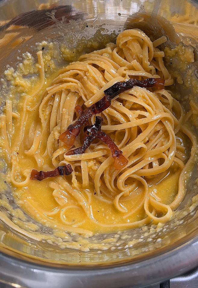 The combination of eggs, cheese, and pasta water creates a naturally creamy sauce.