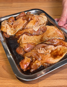 Pour the reserved marinade over the chicken and simmer while basting to get that shiny, thick sauce.