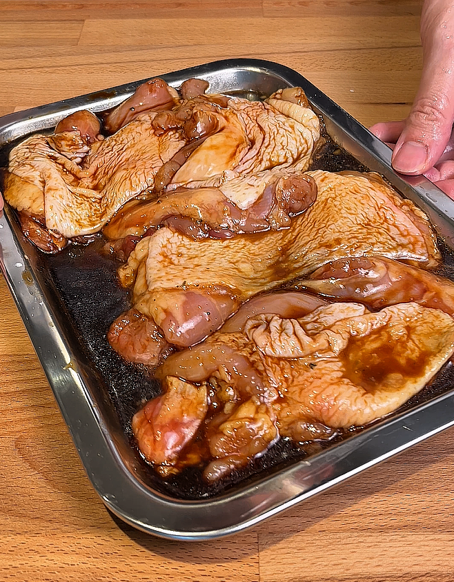 • Marinate the chicken: Marinate boneless chicken thighs with light soy sauce, dark soy sauce, cooking wine, sesame oil, honey, sugar, cornstarch, and black pepper. Set aside.
